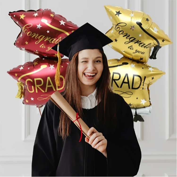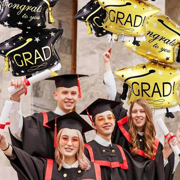 ຊຸດປູມເປົ້າ Cap Graduation Cap 32 ນິ້ວຂອງພວກເຮົາແມ່ນຜະລິດຈາກຟີມ Aluminized PET ທີ່ມີຄຸນນະພາບສູງ 18 ໄມຄຣອນ. ຮູບເງົານີ້ມີຄວາມຍືດຫຍຸ່ນດີ, ຂະຫຍາຍເຕັມທີ່ແລະ fluffily, ແລະທົນທານຕໍ່ການບີບອັດແລະຜົນກະທົບ - ທີ່ສົມບູນແບບສໍາລັບໂຮງຮຽນແລະສະຖານທີ່ທີ່ຄ້າຍຄືກັນ. ພວກເຮົາໃຊ້ຫມຶກທີ່ເປັນມິດກັບສິ່ງແວດລ້ອມສໍາລັບການພິມ, ສົ່ງຜົນໃຫ້ມີສີສັນສົດໃສ, ເຖິງແມ່ນວ່າສີທີ່ທົນທານຕໍ່ການຈາງລົງ. ເຖິງແມ່ນວ່າຫຼັງຈາກຫຼາຍຊົ່ວໂມງຂອງການສໍາຜັດກັບແສງແດດໂດຍກົງ, ເຊັ່ນ: ໃນພິທີຈົບການສຶກສານອກ, ຮູບແບບແລະສີສັນຍັງຄົງມີຊີວິດຊີວາເປັນເຄີຍ.