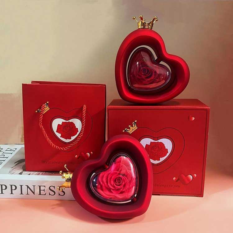 ກ່ອງເຄື່ອງປະດັບດອກກຸຫຼາບຮູບຫົວໃຈໃຊ້ດອກກຸຫຼາບເກຣດ A, ເຊິ່ງມີສີສັນ ແລະໂຄງສ້າງຂອງດອກໄມ້ສົດທີ່ບໍ່ສາມາດແຍກໄດ້.