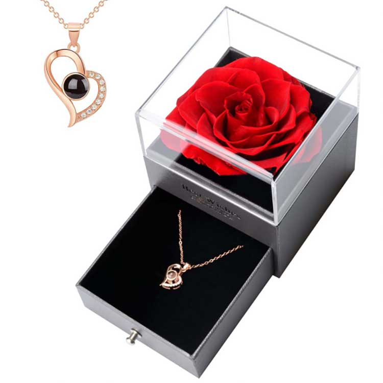 ເຄື່ອງປະດັບຢູ່ໃນກ່ອງຂອງຂວັນດອກໄມ້ Immortal ຍັງເປັນການອອກແບບສະເພາະຂອງພວກເຮົາ. ພວກເຮົາໄດ້ອອກແບບສາມສີຕົ້ນຕໍສໍາລັບເຄື່ອງປະດັບນີ້: ຄໍາ, ເງິນແລະ Rose Gold. ມັນໄດ້ຖືກຜະລິດໂດຍໃຊ້ເທກໂນໂລຍີ electroplating ຄວາມແມ່ນຍໍາສູງ, ຮັບປະກັນວ່າມັນຈະບໍ່ຈາງລົງຫຼືເປັນ rust ເຖິງແມ່ນວ່າຫຼັງຈາກການສວມໃສ່ໃນໄລຍະຍາວ. ເພັດໃນເຄື່ອງປະດັບແມ່ນເຮັດດ້ວຍ zirconium ເກຣດ 5A, ແລະຖືກຕັ້ງຢ່າງພິຖີພິຖັນໂດຍຜູ້ອອກແບບທີ່ມີປະສົບການ 20 ປີ.